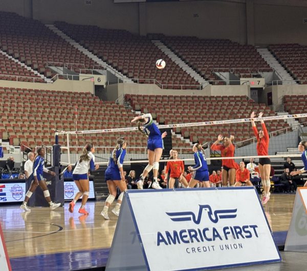 Junior Tessa Larkin ‘27 spikes the ball against opposing team Corona del Sol during the 2025 AIA Volleyball State Championship at the Arizona Veterans Memorial Coliseum. The Xavier Varsity Volleyball team won against Corona del Sol high school, winning their second state championship in a row. (Josie Zalle)